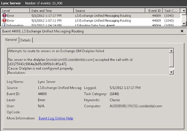 After deploying the second Lync FE pool I found that users in new site (pool) couldn’t call voicemail. Checked the Event logs for the Lync Front End where the users in question are homed and found the following error:-