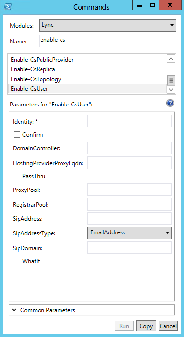 By Typing Show-Command in Powershell you get a pop up window that allows you to load modules. Loading Lync will then allow you to look up any Lync PS commands.