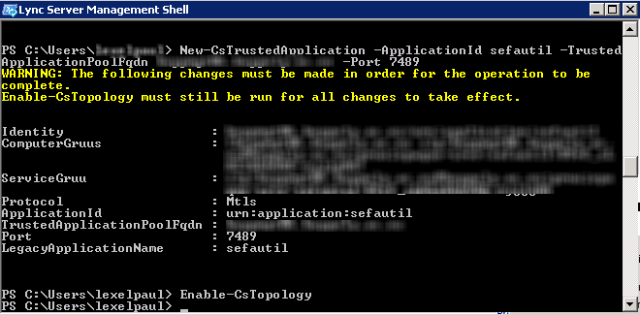 New-CsTrustedApplication -ApplicationId sefautil -TrustedApplicationPoolFqdn mySEFAUtilServer.domain.com -Port 7489