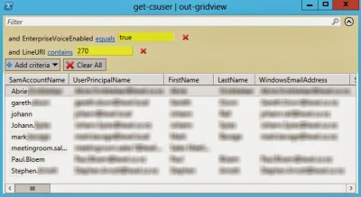 But wait..there is more…you can search for numerous details within the grid output. This could be a range or specific search item. Below I have searched for the last 4 digits of my LineURI (it also searched by extension number!). And yes you can search for PrivateLine as well.