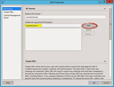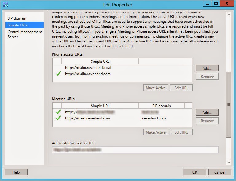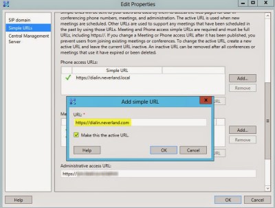 You will notice that the new meeting URL has been added automagically. The new SIP Domain can leverage the existing Dialin URL however in this case it will be dialin.neverland.local which wont do as its not accessible from external.