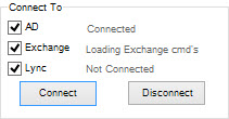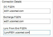 - Fill in your AD, Exchange and Lync Server connection details. Remote PS sessions will be fired off to these in the background.