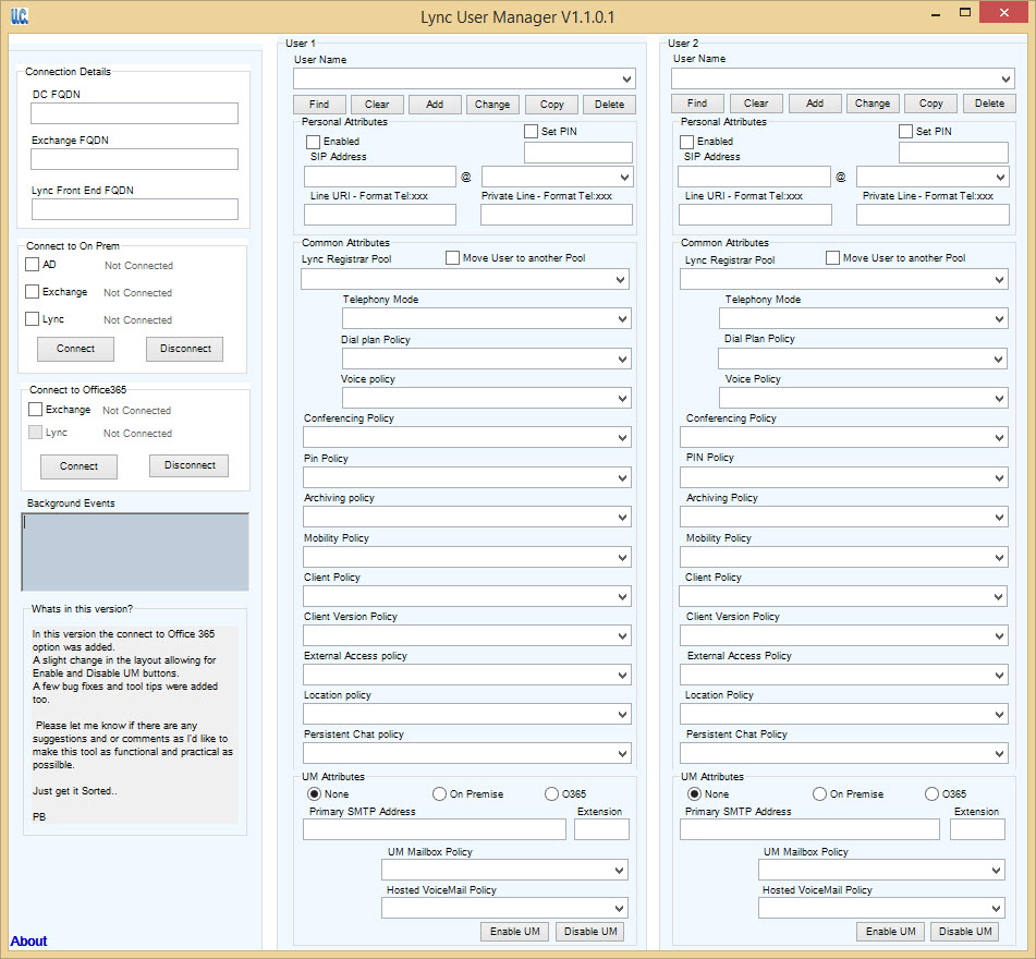, the user details will populate the boxes defining the users current setup. TIP If no data is returned then the user does not exist as a Lync\UM user (yet). - Make changes to the data in the boxes as required and click