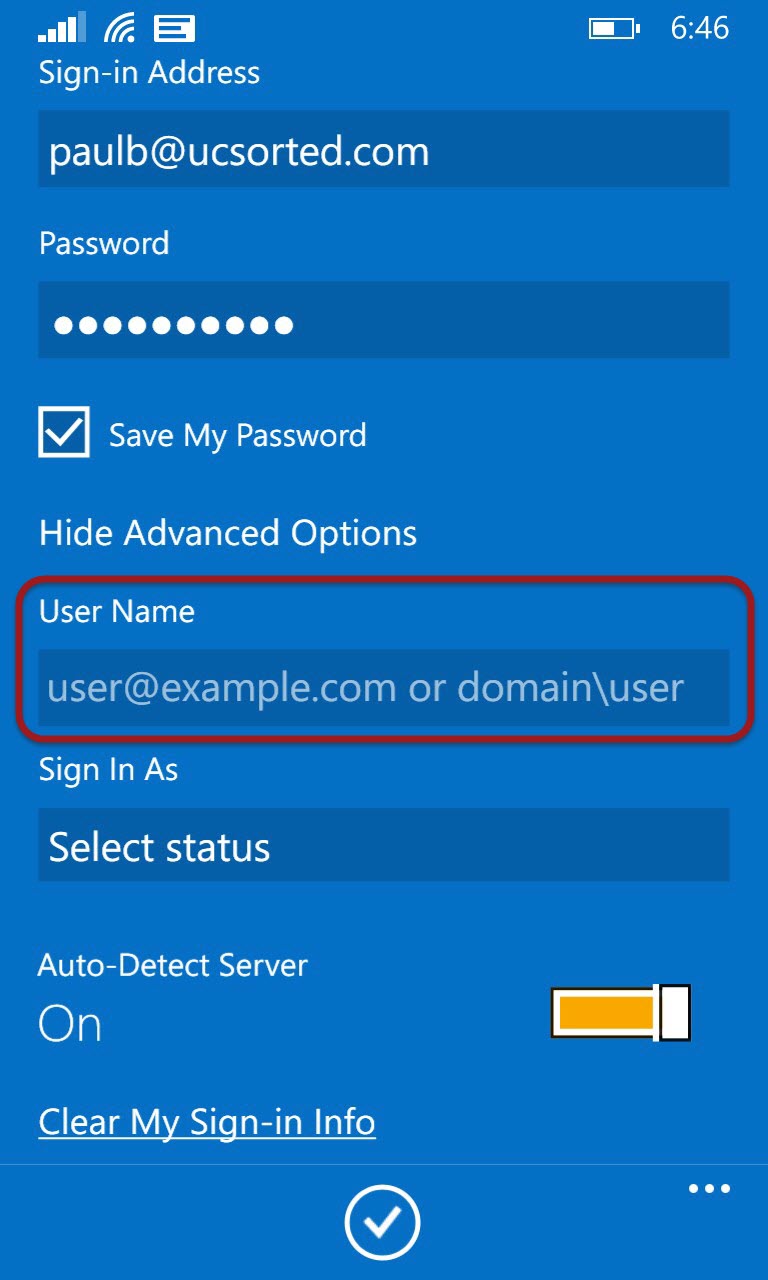 If you enable UPN Naming for the user account and the SIP address is also the UPN address then the mobile user does not need to provide the User Name in Advanced options.