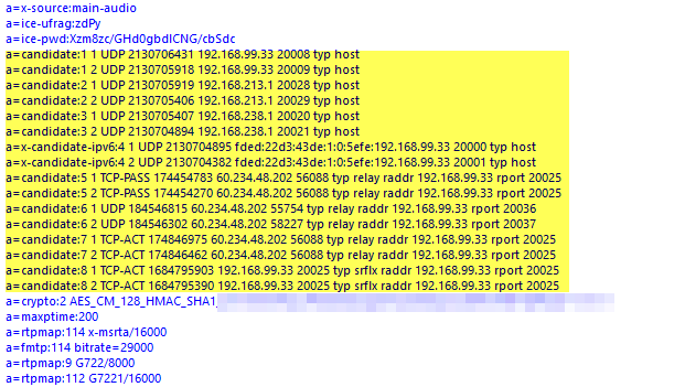 The Diagnostic Header 25; reason=”A federated call failed to establish due to a media connectivity failure where both endpoints are internal”; UserType=”Callee”; MediaType=”audio”; ICEWarn=”0x40003a0″; LocalSite=”192.168.99.33:20008″;LocalMR=”60.234.48.202:54594″; RemoteSite=”10.57.210.11:20003″;RemoteMR=”122.56.25.147:54376″; PortRange=”20000:20039″; LocalMRTCPPort=”55223″; RemoteMRTCPPort=”54376″; LocalLocation=”2″; RemoteLocation=”2″; FederationType=”1″; NetworkName=”ucsorted.com”; Interfaces=”0x6″; BaseInterface=”0x2″; BaseAddress=”192.168.99.33:20018; MrDnsU=”lyncedge01.ucsorted.com”; MrResU=”0″