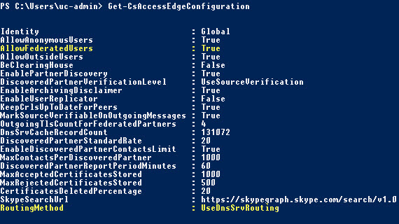 Set-CsAccessEdgeConfiguration -enablepartnerdiscovery $true -UseDnsSrvRouting -AllowFederatedUsers 1