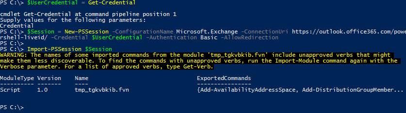 $Session = New-PSSession -ConfigurationName Microsoft.Exchange -ConnectionUri https://outlook.office365.com/powershell-liveid/ -Credential $UserCredential -Authentication Basic -AllowRedirection